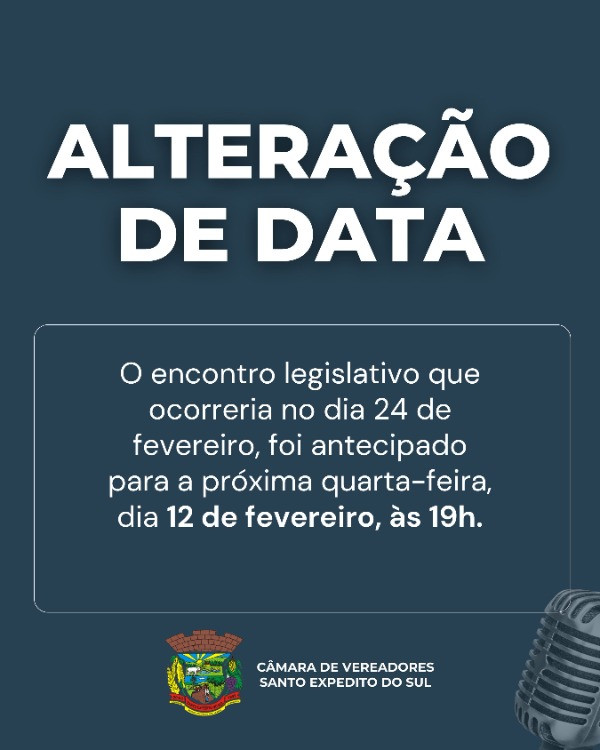 O Presidente do Poder Legislativo Municipal de Santo Expedito do Sul, juntamente com a Mesa Diretora, no uso de suas atribuições legais, torna público para conhecimento dos Vereadores e do povo expeditense que, a Sessão Ordinária que seria realizada no dia 24 de fevereiro de 2025, fica antecipada para o dia 12 de fevereiro de 2025, às 19 horas.