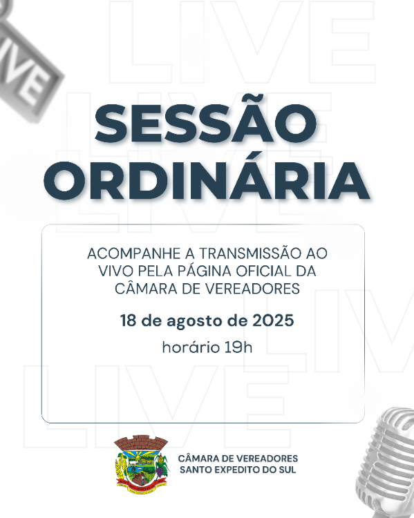 Nesta segunda-feira, dia 18 de agosto, ocorre sessão ordinária na Câmara Municipal de Vereadores. A sessão pode ser acompanhada ao vivo através da transmissão ao vivo nos canais oficiais da câmara municipal no Facebook e Instagram, a partir das 19h.